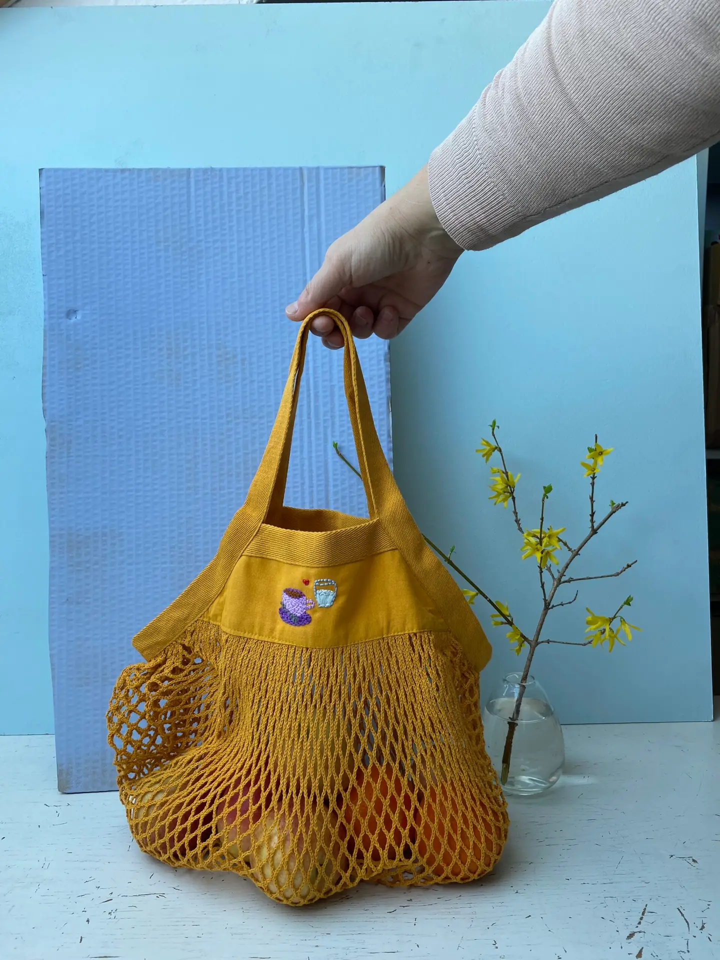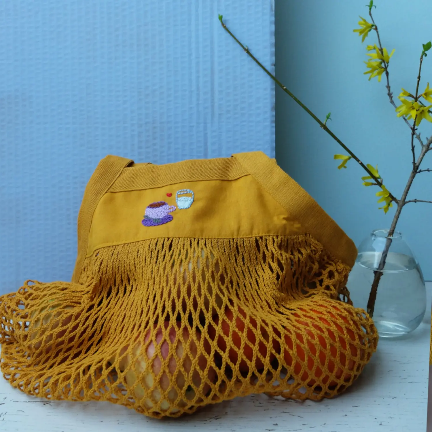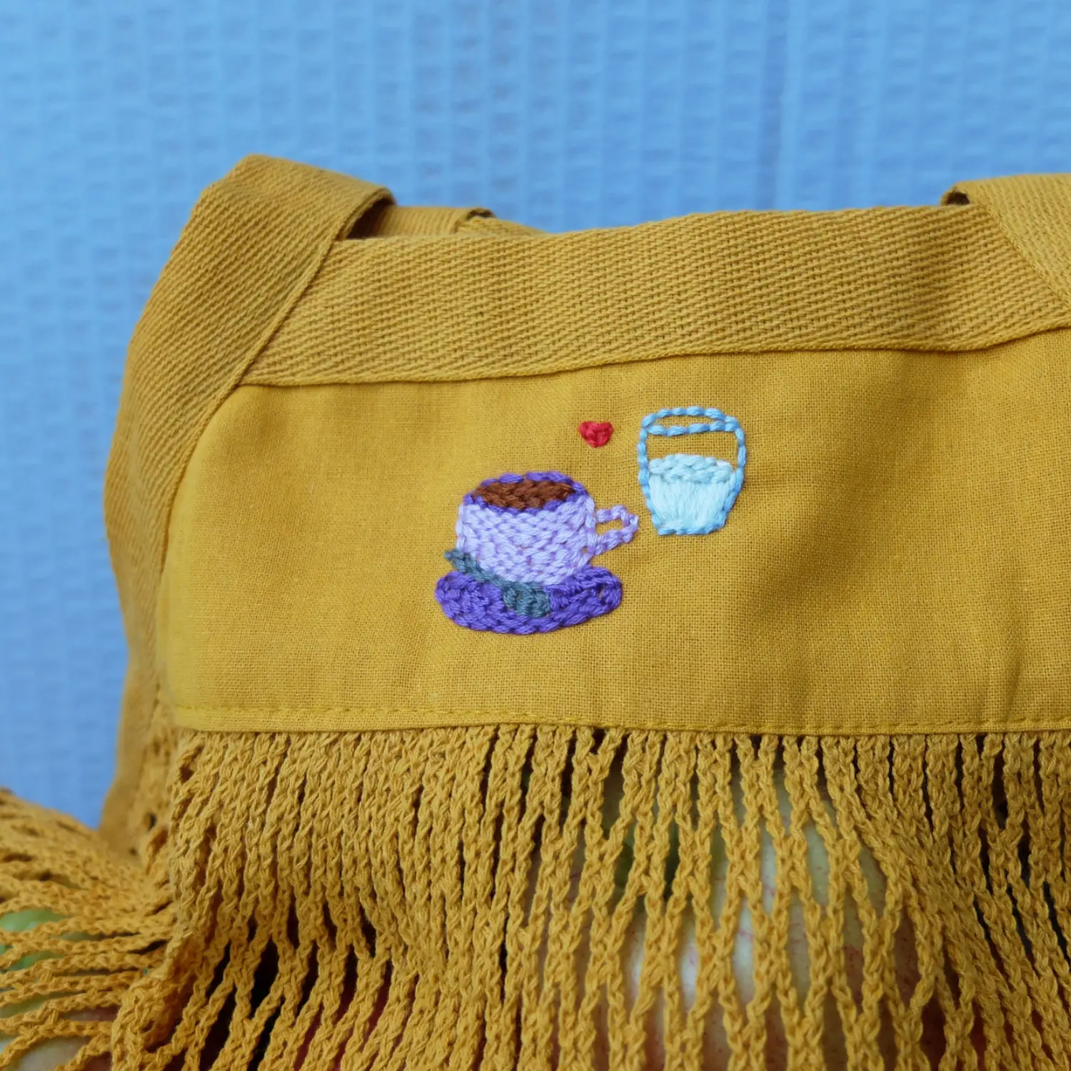 Häkeltasche mit handgesticktem Kaffeemotiv